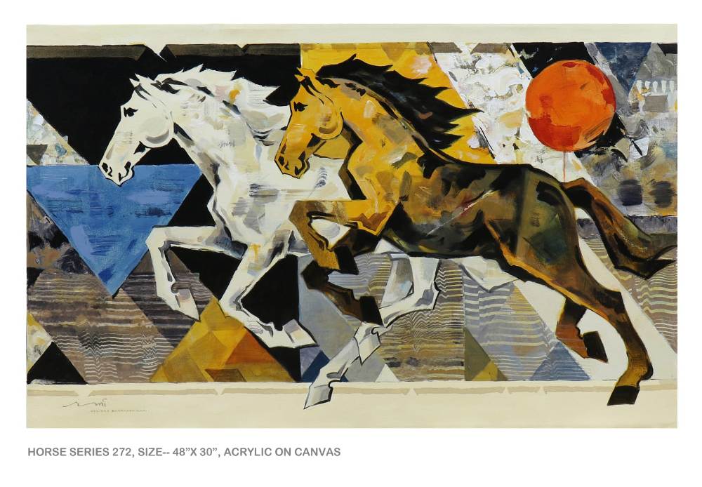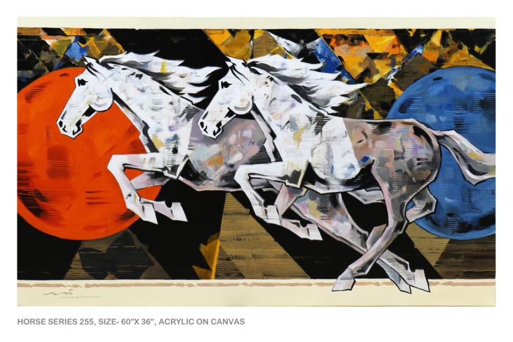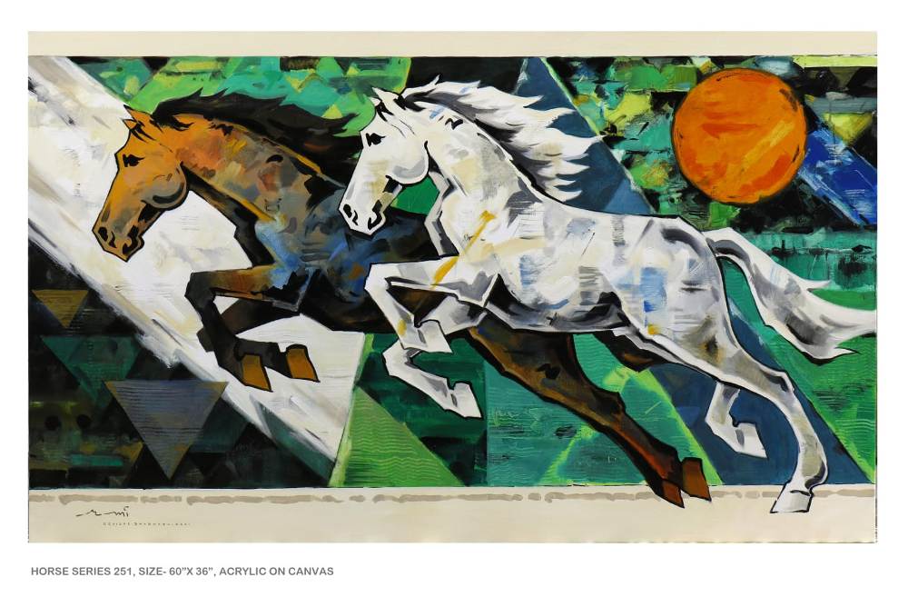The subject itself is enthusiastic. Along with this, it is very challenging to portray it in paintings. I have tried to keep the realistic anatomy/ proportion of horses without trying to stylize it. Sometimes I have simplified the form. My paintings are trying to capture the movement of the horse through bold strokes and vibrant colors showing its strength, power, beauty, and force, the different semi-circles in my paintings unleash the power of horses to run towards the goal.