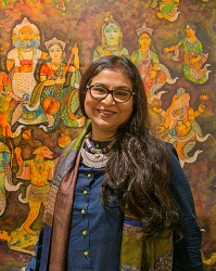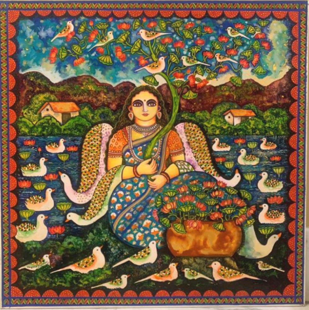 Jayasri Burman born in Kolkata in 1960, got her formal training in art from Kala Bhavan, Santiniketan. A contemporary Indian artist known to support mythical, miniature in her art. Mythological entities as if come alive in her beautiful paintings.