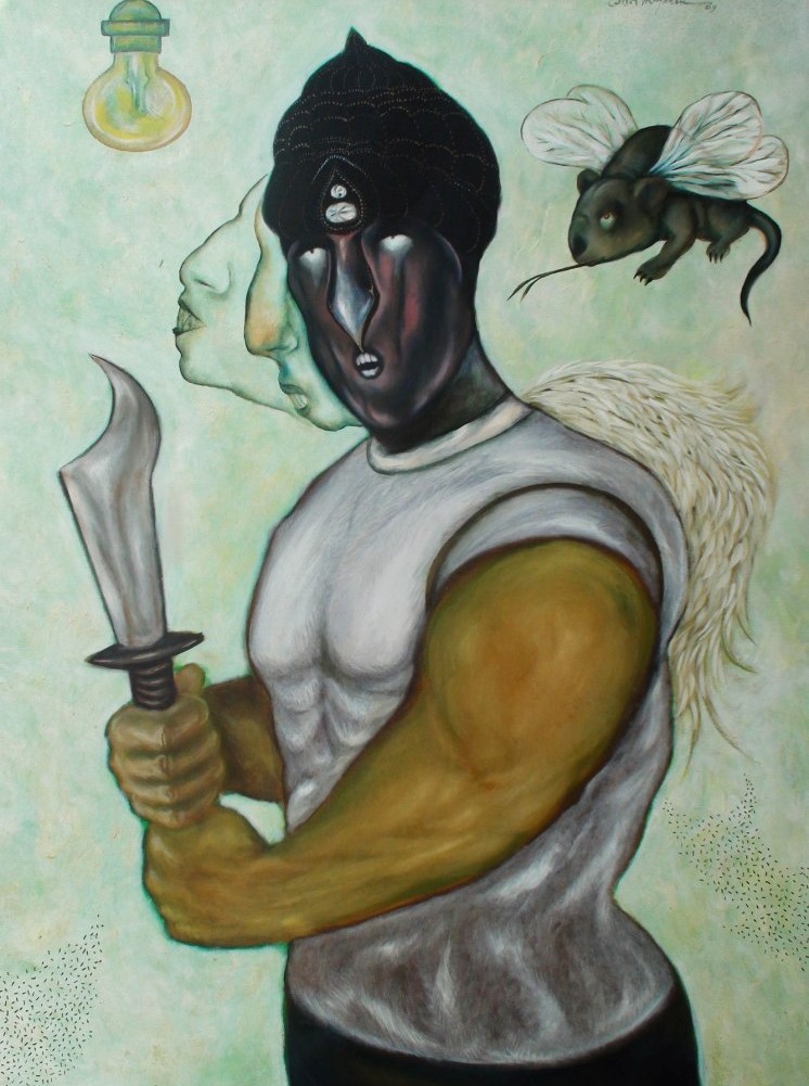 Born 1975 in Goa Viraj Naik did his BFA at the Goa College of Art in Panjim, and later his MFA from Sarojini Naidu School of Fine Art at the Central University, Hyderabad, working closely with the celebrated graphicist K Laxma Goud. He has also been Guest Faculty Member at Sarojini Naidu School of Fine Art, University of Hyderabad. Returning to his base in Goa he has set up an informal workshop-platform at Vasco da Gama to help fellow artists while also pursuing his own artistic practice. Viraj a proficient and established graphic artist and printmaker displays the same mastery of skill in his paintings be they in oils, acrylic, mixed-media usage or drawings in graphite, charcoal and crayon. Viraj with an innate understanding of colour and texture, employs it with a restrain and telling effect. His graphics are evocative of movement and action, traversing from the world of the credible to the incredible. A fine story teller his paintings part human part animal, spell a variety of fictions pregnant with variable interpretations depending on one’s own experiences and ways of seeing. Recipient of several scholarships and awards including the State art award, he has about four solo shows to his credit and has participated in many important group exhibitions as well art workshops in various part of the country. The artist lives and works from his studio in Goa.